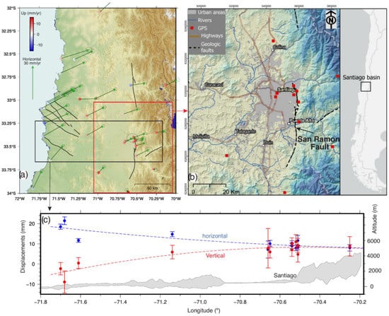 (a) Central Chile region showing the GNSS velocity field and traces of active faults (from Maldonado et al. []). The red and blue rectangles indicate the corresponding areas of Figures (b,c), respectively. (b) Geographical location of the metropolitan area of Santiago de Chile, ALOS DEM 30 mts, was used as background. (c) Cross-section of horizontal (blue) and vertical (red) velocities derived from GNSS data (from Donoso et al. []). A swath profile of the topography is shown in gray.