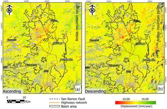 The estimates of the vertical velocity component have been made with the combined ascending and descending data sets to obtain the vertical displacement . A 90-m square element network was used to resample the point data sets on a regular grid and link the output data sets into a single layer. Both P-SBAS outputs (ascending and descending) were available at the same location, i; the combination was achieved under the assumption of negligible north−south velocity, = 0. This assumption is typically used in DInSAR studies to consider the relatively poor visibility of the north−south horizontal motions that the LOS sensor can achieve []. The horizontal E−W displacement components in the Santiago basin region are much lower than the vertical ones; therefore, they were not considered for our case.