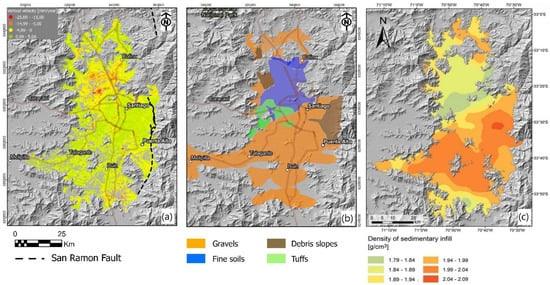 (a) Vertical displacement maps for study area, (b) Sediment cover map, and (c) Density of sedimentary infill map (modified from Yanez et al. []), with ALOS DEM 30 mts used as background.