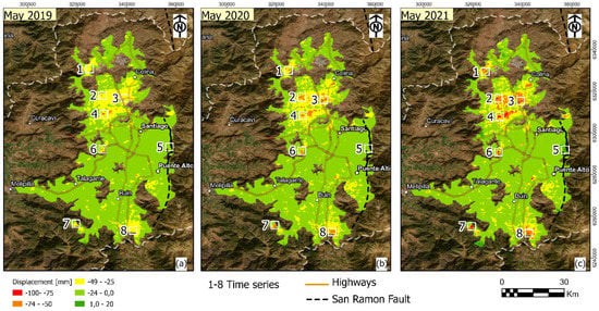 The time series of displacements show values of up to −60 (mm) for the period of May 2018–May 2021 or ~20 mm/year. The greatest deformations are located in the northern area of Santiago, in the towns of Polpaico (Time series 1), Lampa (Time series 1), and Quilicura (Time series 3–4). On the other hand, the area of the San Ramon fault (Time series 5) appears stable and there is no evidence of activity in the fault. In Maipu west (Time series 6), an anthropogenic deformation caused by the increase in urbanization in the area is observed. The wetland “Aculeo” (Time Series 7) is close to the “Aculeo” lake, which has been drying up dramatically [,]. Finally, for Paine (Time Series 8), an area of intensive agriculture shows an increase in subsidence in recent years.