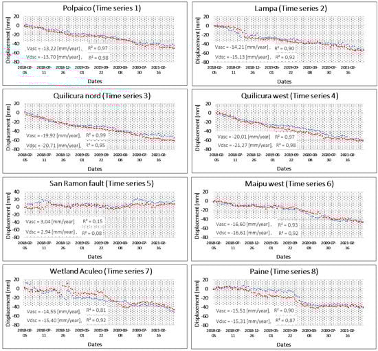 Time series 1–8 in red ascending orbit and blue descending orbit, located at Polpaico, Lampa, Quilicura nord, Quilicura west, San Ramon fault, Maipu west, Wetland Aculeo, and Paine.