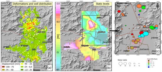 In the Santiago Basin, the DInSAR show a major subsidence effect in the northern anomalous domain (Figure 7a), in good spatial agreement with the region in which the static level is shallower than 10 m (Figure 7b) and where fine sediments of lacustrine origin are emplaced (Figure 4b in Yanez et al. []). The southeastern anomalous domain is also located in a shallow water table region, where gravel sediments show low-density, and thus distal, fine sediments. On the other hand, most of the central and southern part of the basin is dominated by the high-energy gravel material, which is highly rigid, having an almost zero compressional index. In addition to that, the water table in this region shows depths deeper than 50 m (Figure 7b,c). Both factors correctly predict a minor or null surface deformation, as observed in the DInSAR data. The Δu/Δh ratio, which is the skeletal storage in this case, is in the order of 0.01 in the anomalous domains. These values are in good agreement with observations in central Mexico [], Kumato area, Japan [], and Tucson Arizona [].