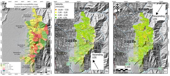 (a) Landslide susceptibility map (modified from Celis, C. []), (b) LOS displacement map for ascending orbit, and (c) LOS displacement map for descending orbit, with ALOS DEM 30 mts used as background.