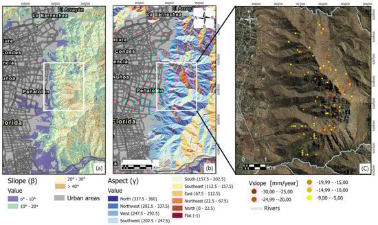 From the geometric relationship, it can be known that in the area of visibility, the closer the slope is to the angle of incidence of the satellite, the more LOS deformation can reflect the real deformation; under this assumption we have selected the descending LOS to continue our analysis. A one-dimensional component along the LOS is suitable for rotational landslides, but not translational landslides. In the study area, the most representative processes are debris flows, which have parallel movements along the direction of the steepest slope. In this case, we project the slope along the steepest slope under the formula proposed by Cascini et al. [], Colesanti and Wasowski [], and Plank et al. []. The slope and aspect values were calculated in GIS and then used in the calculation of the estimated velocity strain along the steepest slope velocity direction (Vslope) in the post-processing phase, where the velocity targets were recalculated. PSI is presented in Figure 9c. For Vslope projection, we consider the Slope (β) > 40° and the values of the slope directions aspect (γ) in the northwest, southwest, and northeast, located in the white box (Figure 9b). We notice that Vslope velocity ranges increased along the slope and were mostly recorded on rocky slopes and soils located on higher slopes (Figure 9a). Thesse results confirmed the correspondence of the most susceptible landslides in the highest areas of the ravines (Figure 8a) and the usefulness of the DInSAR approach to identify regions susceptible to landslide processes.