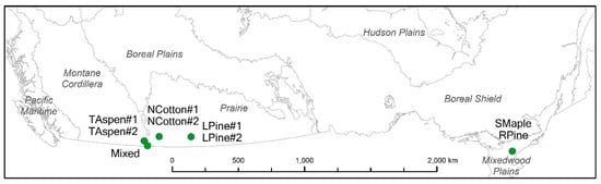 Geolocations of nine Canadian sites with TLS scan collection. Ecozone names are italic. Green dots indicate plot locations and nearby labels show plot ID names.
