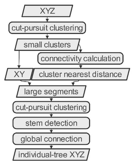 Treeiso is based on the concept that trees are spatial geometries with large horizontal gaps between neighboring stems but considerably smaller 3D gaps within the tree unit. This means trees contain two levels of scales. The branch level has a high 3D freedom of variation, but at the whole tree level, the 3D freedom reduces approximately to 2D due to the uniform upward growth direction of trees. A two-stage segmentation scheme was therefore designed to capture the respective 3D and 2D scales. The tree point clouds were first isolated into small clusters ( = 5, = 1.0 and = 1.0) in 3D, where is the user-defined number of nearest points to search. Their XYZ coordinates were the input , and the inverse of nearest distances were the input edge weight of the cut-pursuit clustering algorithm (Equation (1)). This was the first-stage segmentation. The resultant small clusters form meaningful patches of branches and crowns to cluster further (aggregate) at the individual-tree level.