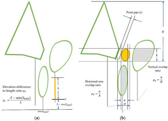 The main cluster of a tree, usually the stems, was first identified if its elevation-difference-to-length ratio was smaller than a threshold (0.5). The definition of was shown in Equation (2),