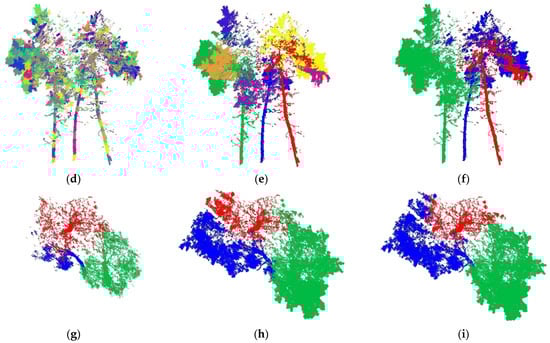 The intermediate output from the major steps of the treeseg and treeiso are shown in Figure 6. The different segmentation strategies of treeseg and treeiso are apparent: the former gradually appends a tree with meaningful parts from remaining point clouds (Figure 6a,b), and the latter iterates each part allocating the same ID to similar tree parts at one time (Figure 6d–f). There are two notable advantages of the latter approach. The allocating-based treeiso is computationally less intensive because multiple clusters can be merged simultaneously after one iteration of all tree parts, while the appending-based treeseg establishes only one cluster after the same iteration. The treeiso used 8.5 min to process TAspen#1 in comparison to treeseg’s 8.1 h. Compared to the reference (Figure 6c,i), treeseg does not identify all of the tree points because those points fail to satisfy the morphological criteria of appending (Figure 6b,g), whereas the treeiso allocates IDs to all parts and does not lose points (Figure 6f,h). Comparing Figure 6h,i illustrates minor differences between the treeiso results and the reference. An obvious piece from the left tree (in blue) was misinterpreted by treeiso as a part of the middle tree (in red) due to the large gap to other blue points caused by scan occlusion.