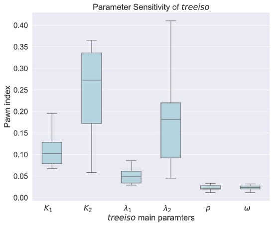 The PAWN index was calculated for the parameters which were most influential to the mIoU accuracy. For each parameter, PAWN values from 10 slices were outputted, and the final PAWN index was the median of all PAWN values (black lines in the middle of each box in Figure 8). Comparing the PAWN index of the six tunable parameters, the descending order of parameter sensitivity was from , , , , to . The first three parameters were most prominent, seen by their highest PAWN median values. It is also clear that the second stage of segmentation was more important to the isolation results than the first-stage and than the final global connection. Overall, the treeiso model did not have equal parameter importance. Users could therefore focus on tuning only three parameters, , , and , for rapid accuracy optimization.