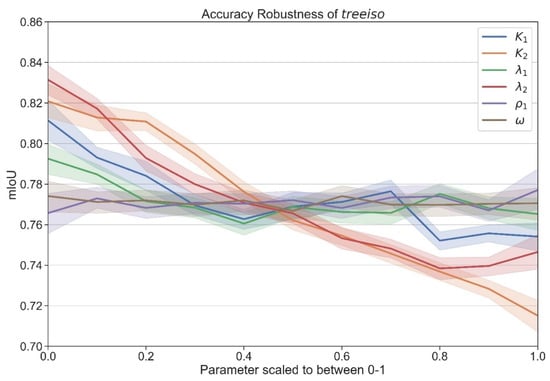 Figure 9 illustrates mIoU variations in response to separate parameter variations to understand the robustness of treeiso and the optimal values for each parameter. It is observed that most mIoUs declined as the parameter increased. Except for the and parameters, the mean mIoU remains above 0.75. This indicates the robustness of the treeiso model. The optimal values scaled back to the original parameter spaces were = 10, = 5, = 3, = 0.1, = 0.0 or 0.6, and = 2, respectively. They differed from the default values in Table 2. In most cases, smaller parameter values attained higher mIoU, but in practical large point cloud data applications, the increased computation time from small segments could be a constraint.
