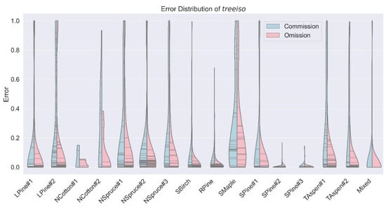 Plot-level summaries of the commission and omission error distributions for individual trees. The commission and omission error were placed side by side for each of the sixteen plots to provide visual contrast. Within each violin, each tree has one commission (one solid horizontal line in the light blue half) and one omission error (one solid horizontal line in the light pink half). A violin creates a smooth outline to illustrate the distribution of plot-level error frequencies. The width of one horizontal line denotes the relative frequency of the error where the total area of a violin is normalized to 1.