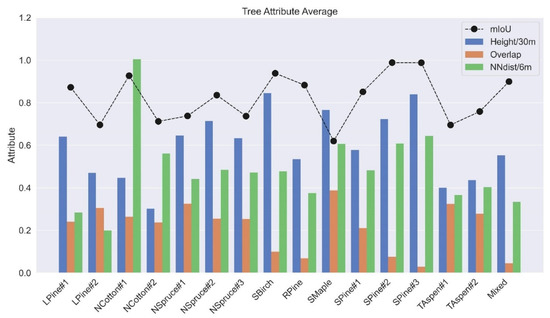 Understanding the correlation between factors and accuracy helps explain why IoU deviates among the same species and apparent difficulty levels. The three most influential attributes, tree height, overlap, and NNdist, are illustrated with their average values for each plot in Figure 11. Tree height and NNdist were normalized to match the scale of the overlap attribute. Figure 11 clearly shows that NCotton#1 has a high NNdist, which contributed to its high mIoU of 0.91 compared to NCotton#2′s mIoU of 0.73 (see also Table 3). The highest mIoUs above 0.9 from RPine, SPine#2, SPine #3, and Mixed can all be explained by their low overlap ratio of <0.1. Figure 11 also confirms that the treeiso isolation accuracy was not a function of a single factor. For example, NCotton#1 and NCotton#2 shared a similar overlap ratio but their mIoUs varied greatly. RPine had a lower overlap ratio than SBirch, but its mIoU was greater by 0.06 due to its greater tree height and NNdist. LPine#2 was visually interpreted as having a medium isolation difficulty but its relatively high overlap ratio, short tree height, and small NNdist lead to a mIoU of 0.70, which is lower than some difficult deciduous plots such as NSpruce#1, TAspen#2, and NCotton#2.