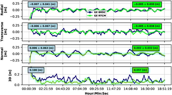 Furthermore, when using broadcast ephemerides without applying SSR corrections, the ambiguity term is modeled to absorb the effect of orbit and clock errors projected onto the line of sight by adopting process noise in the estimation, resulting in the so-called pseudo-ambiguity [,]. In that case, the standard deviation associated with the pseudo-ambiguity process noise is 0.1 mm and 0.8 mm for Galileo and GPS, respectively. Additionally, the empirical acceleration steady-state standard deviations result from a filter-tuning process. For both cases with and without SSR corrections, their values are 0.01 nm/s, 0.01 nm/s, and 0.12 nm/s in the radial, transverse, and normal directions, respectively.