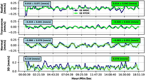 S6A orbital velocity difference with respect to CNES-POD reference solution on 4 September 2021. Two solutions are compared: the first is obtained by using only broadcast navigation data (blue-colored lines), and the second is found by correcting the broadcast navigation data using RTCM corrections from CNES (green-colored lines). For the individual axes (RTN frame), the mean values ± standard deviation of the differences are provided (light-blue-filled boxes for BRDC and light-green-filled boxes for RTCM). The RMS value is shown for the 3D panel.