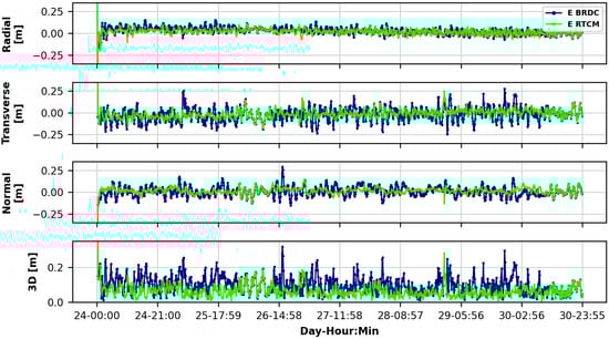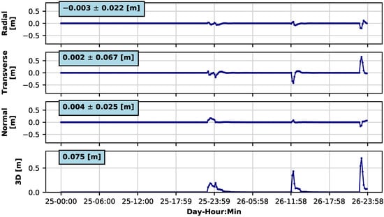 The results obtained without the aid of SSR (blue-colored curves) are compared to those achieved by applying the corrections (green-colored curves). It can be recognized that during some periods, the two solutions overlap. Specifically, that is the case between 25 September and 26 September and during the second part of the day on 30 September (see Figure 3 and Figure 4). The reason for such behavior is that, in the simulated real-time, no corrections are available during those periods. However, as can be observed, the switch between using and not using the corrections does not cause any discontinuity in the solution. No filter transient is brought about by this discontinuity to adhere to a different accuracy level of GNSS orbits and clocks. Therefore, the results suggest that the strategy with the ambiguity re-initialization adopted in the filter successfully deals with SSR data outages. Figure 5 highlights the effectiveness of the strategy. It shows the difference between applying and not applying the re-initialization method. It can be observed that without re-initialization a filter transient is introduced with peaks in the 3D position solution larger than half a meter.
