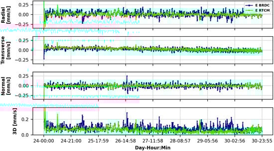 The distribution of the 3D differences between the UNIPD and the CNES-POD solutions is further analyzed by looking at Figure 6a,b. These figures show the percentage of differences (y-axis) below a certain amount (x-axis). Both Figure 6a,b indicate that the E RTCM curve is steeper than the E BRDC curve. It can be recognized that all the E RTCM differences are below 18 cm and 0.18 mm/s for position and velocity, respectively; 60% of all the E RTCM differences are below 7 cm, while the E BRDC curve reaches the 60% level at roughly 11 cm. Concerning velocity, 60% of the E BRDC solutions are below 0.09 mm/s, and application of the corrections (i.e., E RTCM configuration) diminishes the value to 0.07 mm/s.
