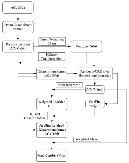 (6) The Helmert transformation parameters between and with unequal satellite weights are calculated using the least squares method [,]. The analysis center orbits is transformed to by Helmert transformation parameters. The final combined orbit can be expressed as: