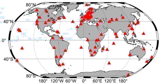 IGS initiated the multi-GNSS experimental (MGEX) in 2011 and built observation networks with multi-GNSS tracking capability. Currently, approximately 250 stations can track multi-GNSS observation signals, including GPS, GLONASS, GALILEO, BDS, and QZSS signals []. To ensure the reliability of orbit determination, 140 globally distributed MGEX stations are selected for CGS orbit determination. The distribution of these stations is shown in Figure 2, and data from the DOY 213 to 215 in 2022 are collected in 30 s intervals. These stations are equipped with different receiver types, including Javad, Septentrio, Trimble, and Leica.