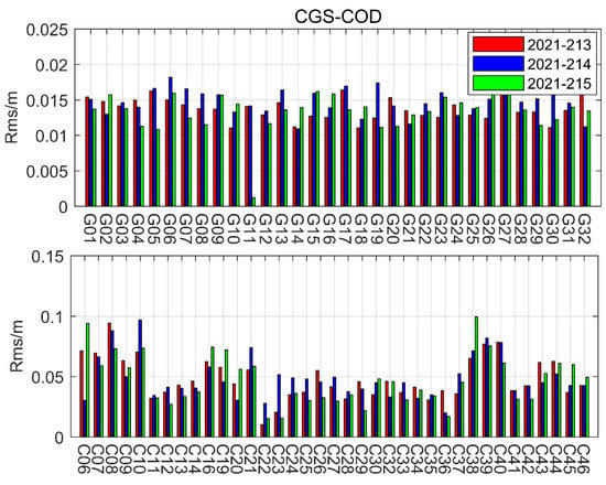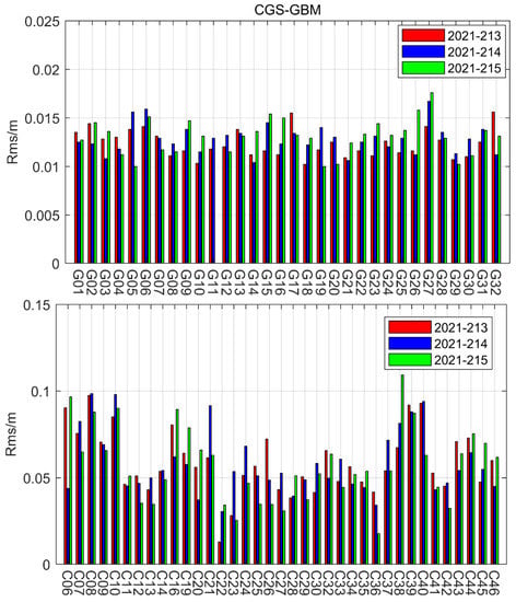Figure 4 displays the RMS values of GPS and BDS orbit errors between the CGS and GBM. Similar to the results the Figure 3, the RMS values of GPS satellites are basically within 1.5 cm, and the mean RMS values between the CGS and CODE GPS orbits is 1.43 cm. The results prove that CGS orbits are consistent with CODE orbits. Besides, the RMS values of the BDS MEO satellite’s three-dimensional errors are around 5 cm. The three-dimensional orbit errors of IGSO satellites are also larger than MEO satellites; among all the satellites, C38 presents worse accuracy than the other satellites.