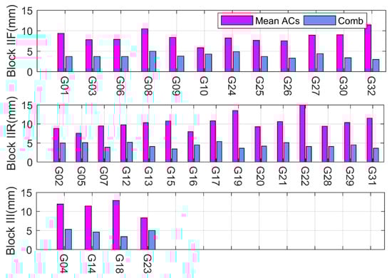 As can be seen from Figure 5, the pink bar represents the orbit SISURE between the mean analysis centers and the IGS final products; the blue bar represents the orbit SISURE between the combined orbits and the IGS final products, the subplots in the figure represent the orbit SISURE for different orbit types of GPS satellites. It can be seen that the orbit SISURE of the combined orbits is significantly reduced compared to the mean SISURE for all analysis centers. In addition, Table 2 shows the mean values of SISURE for different orbit types of GPS satellites. For Block IIF satellites, the mean orbit SISURE and the combined orbit SISURE are 8.66 mm and 4.15 mm, respectively. For Block IIR satellites, the mean orbit SISURE and the combined orbit SISURE are 10.67 mm and 5.43 mm, respectively. For Block III satellites, the mean orbit SISURE and the combined orbit SISURE are 11.28 mm and 5.63 mm, respectively. Based on these statistics, we find that the orbit combination improved orbit accuracy for different types of GPS satellites. This demonstrates the effectiveness of the orbit combination method in this research.