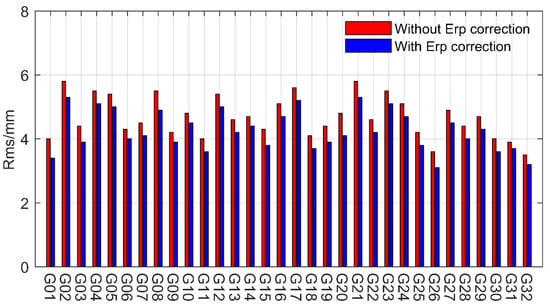 In this section, the influence of the ERP correction on the accuracy of the combined orbits is analyzed and shown in Figure 6. To evaluate the quality of combined orbits, the final precise ERP product of IGS is set as a reference. As seen in the Figure 6 result, the red bar represents the RMS values of the orbit errors between the combined orbits without ERP correction and IGS orbits. The blue bar represents the orbit errors between the combined orbits with ERP correction and IGS orbits. It can be seen from Figure 6 that the accuracy of the combined orbit is improved by the ERP correction. The mean RMS of the without ERP correction orbits and with ERP correction orbits is 4.78 mm and 4.53 mm, respectively.