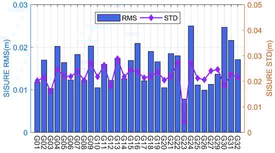 Firstly, the mean value of the Root Mean Square and Standard Variation for all GPS satellites over 30 days is counted, and the statistical results are shown in Figure 8. As can be seen in Figure 8, the cylinders and dashes present the RMS and STD, respectively. It can be seen that the RMS values of the SISURE for the combined orbits are all within 3cm, and most of them are less than 2 cm. The values prove the reliability of the combined GPS ultra-rapid orbits. The SISURE STD for all GPS satellites is also within 3cm over 30 days, further validating the combined orbit accuracy.