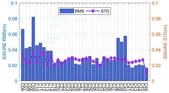 In addition, the mean RMS and STD of BDS satellites are shown in Figure 11. As seen in Figure 11, the RMS of the combined orbits of the BDS MEO satellites are all within 4 cm, and the RMS of the BDS-3 MEO satellites are all essentially around 2 cm. The RMS values of the integrated orbits of the BDS IGSO satellites are all above 4 cm, significantly larger than those of the MEO satellites, mainly due to the relatively few stations that can observe the IGSO satellites. Besides, the mean STD for all BDS satellites is also within 4 cm, which proves the reliability of the combined BDS ultra-rapid orbits.