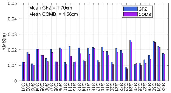 To further verify the validity of the orbit combination, the 10-day combined ultra-rapid orbit is selected for an accuracy comparison with the GFZ ultra-rapid orbit. Figure 12 represents the RMS values for the GPS ultra-rapid orbit and the combined GPS ultra-rapid orbit with the final orbit for GFZ, respectively. As can be seen from Figure 12, compared to the GFZ ultra-rapid orbit, the combined ultra-rapid orbit accuracy significantly improved. Most of the satellites in the GFZ ultra-rapid orbit have error values of 2 cm or more, but the combined ultra-rapid orbit differences are largely within 2 cm. The average RMS of the combined GPS satellites is 1.56 cm, and the average RMS of the GFZ is 1.70 cm; the orbit combination improves the ultra-rapid orbit accuracy of GPS satellites by 8.2%.