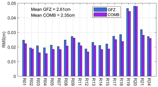 Figure 13 depicts the RMS values for the GLONASS ultra-rapid orbit. The results show that the orbit combination is also valid for GLONASS satellites and that the combined GLONASS ultra-rapid orbit is also improved compared to GFZ. The average RMS for the GLONASS satellite combined ultra-rapid orbit and the GFZ ultra-rapid orbit is 2.61 cm and 2.35 cm, respectively. The orbit combination improves the ultra-rapid orbit of GLONASS satellites by 9.9%.