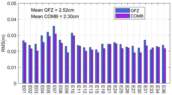 Figure 14 shows the statistical results for the ultra-rapid orbit of the GALILEO satellites. It can be seen that the orbital combination also significantly improves the accuracy of GALILEO satellites. The average RMS for the GALILEO satellite combined orbit and the GFZ orbit is 2.52 cm and 2.30 cm, respectively. The orbit combination improves the ultra-rapid orbit of GLONASS satellites by 9.9%.