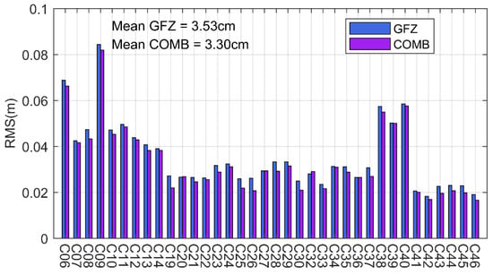 Figure 15 shows the statistical results for the ultra-rapid orbit of the BDS satellites. As can be seen in Figure 15, the average RMS for the combined orbit is 3.53 cm, and the average RMS for the GFZ ultra-rapid orbit is 3.30 cm. The statistics from the BDS satellites show that the accuracy of the orbit combination for ultra-rapid orbit has improved for both IGSO and MEO satellites, and the average improvement is 5.5%.
