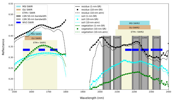 Comparison of SWIR bands on current multispectral sensors with field-collected spectra. The solid lines correspond to 1 nm interval (30 nm bandwidth) spectra, the points correspond to surface reflectance (SR)-processed 10 nm spectra, and dashed lines correspond to 10 nm spectra with atmospheric artifacts (atm-processed). The 10 nm spectra provide an illustration of imaging spectrometer capabilities, e.g., PRISMA and AVIRIS, with and without atmospheric correction. Previously evaluated Landsat Next (LSN) bands are depicted with gray bars [37]. For LSN bands, a combination of 2040, 2100, and 2210 nm bands corresponds to an absorption-centered index, e.g., CAI, and a combination of 2100, 2210, and 2260 nm corresponds to a peak-centered index, e.g., LCPCDI. Crop residue lignocellulose absorption features at 2100 and 2300 nm are effectively identified by LSN bands, and WV3 bands for the 2300 nm feature. Current Landsat/Sentinel-2 SWIR bands do not accurately resolve these absorption features.