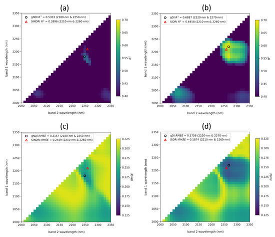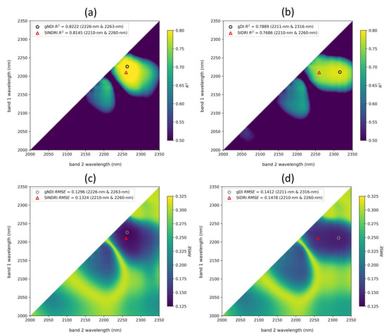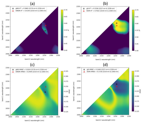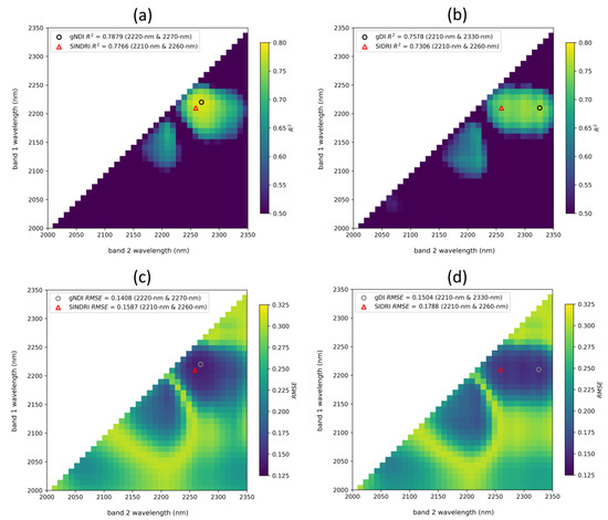 Performance metrics for two-band gNDI and gDI using 1 nm interval full-NDVI dataset with n = 916: (a) gNDI-R2, (b) gDI-R2, (c) gNDI-RMSE, (d) gDI-RMSE. All spectra were processed to surface reflectance. In all panels, the black circles represent the band combination that produced the best fR estimation performance, as defined by the respective performance metric. The red triangles depict the band combination of a comparable heritage index.