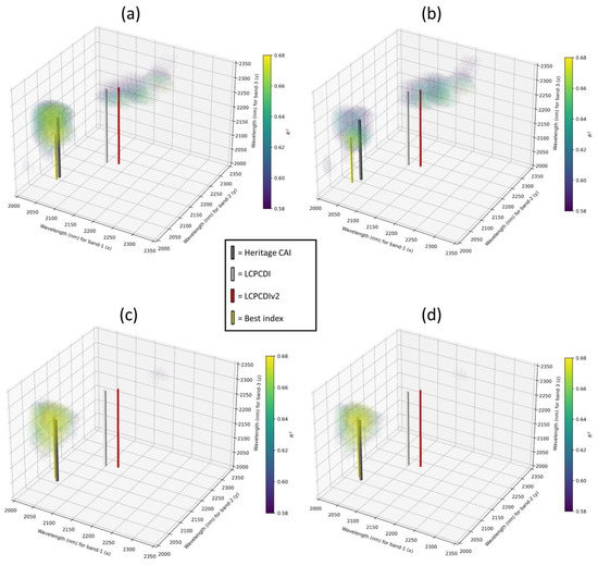 Three-band wavelength shift analysis fR estimation results with the 10 nm full-NDVI dataset. (a) gCPDI (full-NDVI) surface reflectance, (b) gCPDI (full-NDVI) with atmospheric artifacts, (c) gCPRI (full-NDVI) surface reflectance, (d) gCPRI (full-NDVI) with atmospheric artifacts. Note that the top-performing index wavelengths (determined by R2) largely cluster in the CAI wavelength region. Although the LCPCDI high correlation clusters were maintained for the difference indices (panels a–b), this was not so for the ratio indices (panels c–d). Full-NDVI dataset has n = 916. Rotational, interactive versions of panels a and c are provided in Supplementary Materials Figures S7 and S8.
