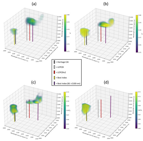 We applied the three-band wavelength shift analysis to the 1 nm interval dataset, including a sub-processing routine identifying the differences in performance between the spectral locations of the top-performing wavelength shift indices across the 2000–2350 nm range (approximately corresponding to CAI band spectral region; ~2000–2200 nm) and spectral regions where the band 1 > 2100 nm constraint was imposed (approximately corresponding to LCPCDI spectral region; ~2100–2300 nm).