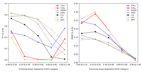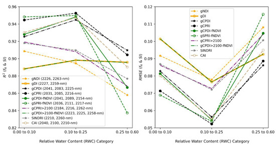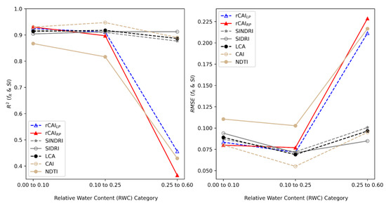 Wavelength shift spectral index (SI) fR estimation performance according to RWC class (with heritage SINDRI and CAI for performance comparison). Left panel is R2 and right panel is RMSE. Note that “-fNDVI” denotes wavelength shift index derived from the 1 nm interval full-NDVI dataset, other wavelength shift indices are derived from the NDVI < 0.3 dataset.