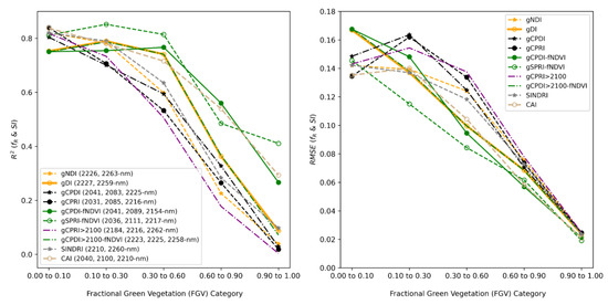In the green vegetation analysis, nearly all indices exhibited a decrease in both R2 and RMSE above 0.3 fGV. For reference, an fGV level of 0.3 has been found to correspond to an NDVI value of approximately 0.473 while an fGV level of 0.6 corresponds to an NDVI of 0.683 for green cover crops [45]. The decrease in both R2 and RMSE is likely attributed to variance in index values diminishing for a given fGV category while also becoming less correlated with fR (regression error and explained variance both decreasing). NDTI was the worst performing index as indicated by low R2 and increased RMSE compared to other indices (Figure 11 and Figure 12). The two-band rCAIRP was the second worst performing index overall after NDTI. In terms of the heritage indices (Figure 11), three-band CAI was again a top-performing index. The wavelength shift index that performed best across a range of fGV conditions was the gSPRI computed from the full-NDVI dataset (Section 3.4). The gCPDI (full-NDVI dataset) also performed well. Compared to these two top-performing wavelength shift indices, CAI was a comparable performer and performed far better than SINDRI for fGV categories above 0.3. In the majority of cases for RWC and fGV analyses, the top-performing index bands are spectrally close to CAI band wavelengths (Figure 9, Figure 10, Figure 11 and Figure 12).