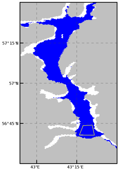 Valid water pixels of the Gorky Reservoir on 31 May 2022 (blue), used to estimate the number of pixels with the CHLFAIL flag. Gray color denotes the land mask, white color, the coastal areas marked with the CLDICE flag due to high radiance values, and the yellow quadrangle is the test polygon for evaluation of AOD and Rrs.
