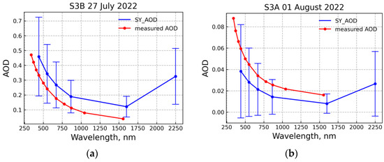 AOD spectra from SYN_AOD products (blue lines) and in situ measurements (red lines): (a) 27 July 2022; (b) 1 August 2022. The vertical lines show the AOD uncertainties equal to one standard deviation.