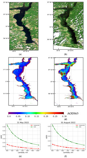 AOD865 according to OL_2_WFR: 31 May 2022 (left side), 1 August 2022 (right side); (a,b) are the RGB composite (665, 560, and 490 nm), AOD measurement stations are marked by pins; (c,d) are the distributions of AOD865 in the Gorky Reservoir; (e,f) are the OL_2_WFR AOD spectra (green lines) and measured AODs (red lines).