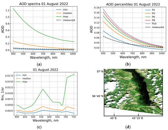 AOD and Rrs spectra retrieved from the Sentinel-3A/OLCI image for 1 August 2022: (a) AOD spectra in the test region according to AC ac-2 (the minimum AOD spectrum is shown by the blue line, the median by the orange line, and the maximum by the green line) and measured AOD (black dotted line); (b) AOD percentiles in the test area according to AC ac-2 (P2, P4, P6, P8, and P10 are the second, fourth, sixth, eighth, and tenth percentiles, respectively) and measured AOD (dashed black line); (c) Rrs spectra in the test area according to AC with fixed AOD based on the second percentile P2 (the minimum Rrs spectrum is shown by the blue line, the median by the orange line, and the maximum by the green line); (d) Sentinel-3A/OLCI RGB composite for 1 August 2022.