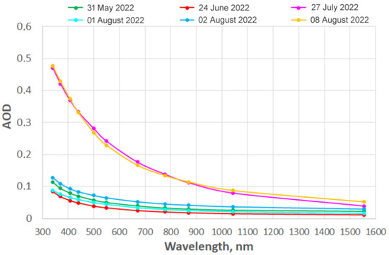 The regular measurements of the atmospheric aerosol properties were launched in 2022 and carried out from May to August. In contrast to areas of seas and oceans with powerful convection, inland waters of temperate latitudes, even in summer, often turn out to be partially covered by clouds. Therefore, only 6 days of measurements were selected for further analysis, when the most cloudless Sentinel-3/OLCI images were obtained: 31 May, 24 June, 27 July, 1 August, 2 August, and 8 August.