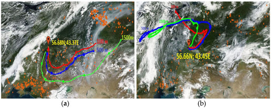 Results of modeling of the five-day HYSPLIT reverse trajectories for the Gorky Reservoir for 8 August 2022 (a) and 27 July 2022 (b).
