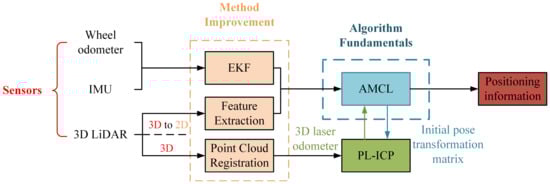 Because the AMCL algorithm requires the input of a 2D laser point cloud, it needs to process the point cloud data of 3D LiDAR, based on which a simple and efficient point cloud conversion method is proposed in this paper. In addition, the AMCL algorithm uses the mobile robot motion model for localization, and the mobile robot motion model involves the wheel speed odometer model. The odometer has accumulated errors during the robot motion, resulting in the limited positional accuracy output by the AMCL algorithm, which reduces the localization accuracy of the mobile robot. To improve the problem of low initial accuracy of the odometer of mobile robots, researchers usually choose to fuse the odometer data of mobile robots with other sensor data and use the fused sensor data as the motion model of the AMCL algorithm for mobile robot localization studies. Currently, the most commonly used sensor is IMU because IMU (Inertial Measurement Unit) is cheaper compared to GNSS (Global Navigation Satellite System) receivers and is easy to be used, not affected by signal interference and more versatile []. However, IMU yaw angle measurement for mobile robots generates cumulative errors as time grows, resulting in the output accuracy of yaw angle and overall positioning stability of the AMCL algorithm not being guaranteed. Given that the fusion of IMU and wheel speed odometer of the mobile robot can obtain more accurate odometer information, and the high-precision three-dimensional laser odometer obtained by 3D LiDAR has a more accurate yaw angle [,,], which can compensate for the unreliability of the IMU yaw angle. The multi-sensing localization method based on 3D LiDAR, IMU and wheel speed odometer is a mobile robot localization scheme with complementary sensing information and high reliability. In this paper, the AMCL algorithm is optimized and improved based on 3D LiDAR, IMU and odometer information to improve the output accuracy and positioning stability of the AMCL algorithm. The methodological framework studied in this paper is shown in Figure 1.