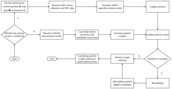 The overall flow of the improved AMCL algorithm based on EKF fusion is shown in Figure 2. The overall process mainly includes particle set initialization, particle swarm update, particle weight calculation and resampling.