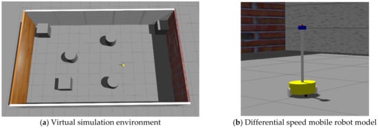 We built a simulation environment through Gazebo software and established a mobile robot model using xacro files, as shown in Figure 4.