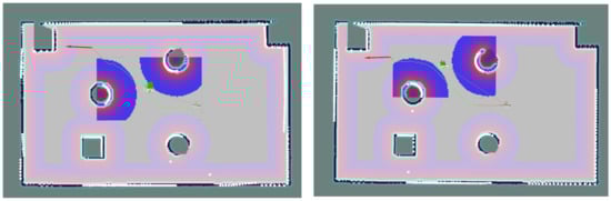 The AMCL algorithm is superior to the MCL algorithm and is widely chosen as the LiDAR probabilistic localization method on mobile robots for localization use. Specifically, it was implemented using a form of ROS nodes, as the algorithm is a stable and maintained version. Most of the parameters of the algorithm are set to default values, where the odometer is selected as the differential model, the laser model is the likelihood field, the maximum number of particles is 5000, and the minimum number of particles is 500. The odometer model defines the equations of motion to better describe the differential motion of the mobile robot, and the laser model describes the probabilistic method used to calculate the probability that the mobile robot is at a certain position given a certain laser measurement; the maximum and minimum particles represent the maximum and minimum possible positions around the mobile robot, respectively.