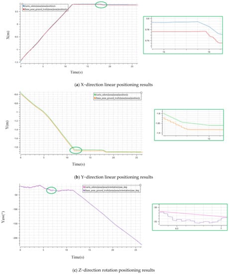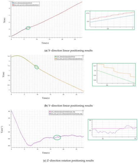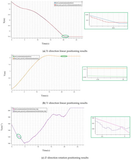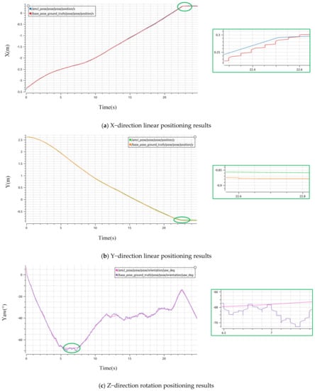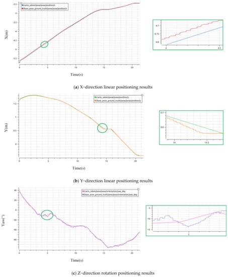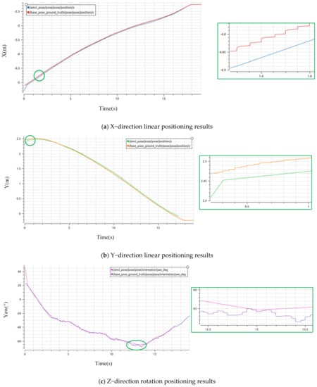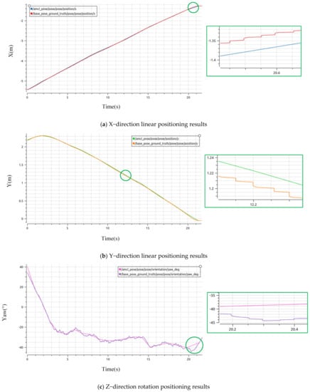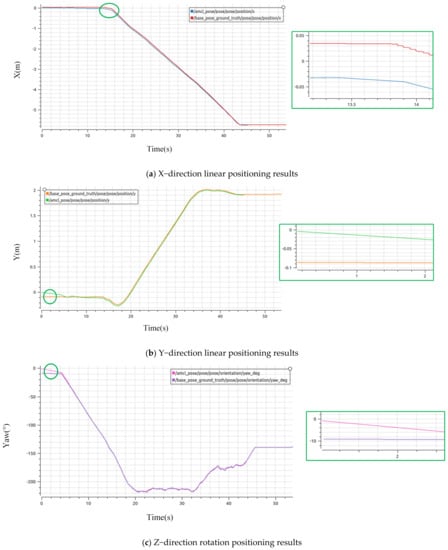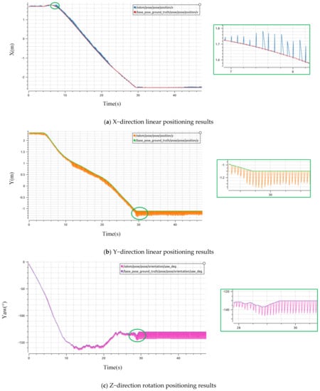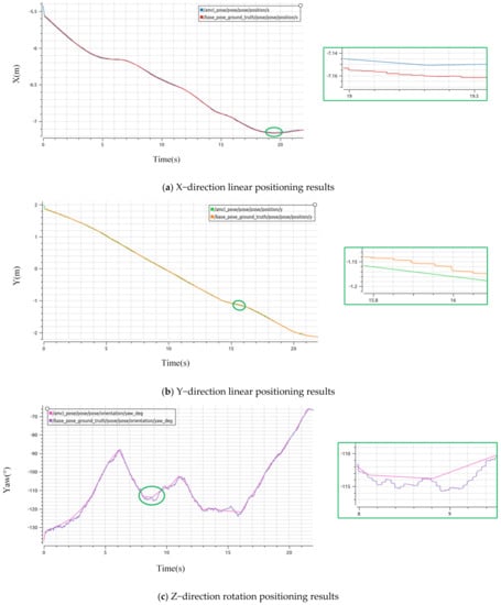 From Figure 6, Figure 7 and Figure 8, it can be seen that the linear positioning and angular positioning results of the original AMCL algorithm have large errors with the actual values, and especially, the curve fitting of the yaw angle is poor. There are many fluctuations, and the fluctuation magnitude is large.