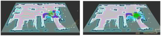 Point cloud correction before and after navigation map. The left figure shows before correction, and the right figure shows after correction, the white color shows the 2D laser point cloud data obtained after the conversion of 3D laser point cloud data, the green color shows the AMCL algorithm particle swarm, and the light purple part shows the cost map after the expansion.