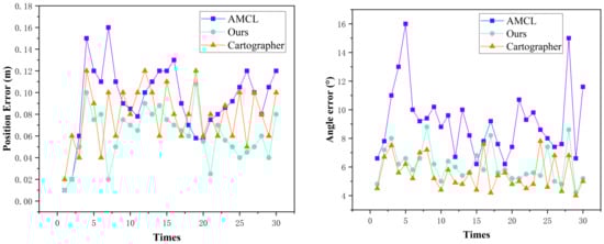 Compared with the original AMCL algorithm, the maximum positioning error of the improved AMCL algorithm in this paper is smaller, and the accuracy of both linear and angular positioning is significantly improved. Meanwhile, among these three algorithms, the improved AMCL algorithm in this paper has a good advantage in linear positioning accuracy. The maximum positioning error of the cartographer algorithm is more stable, the overall positioning accuracy of the algorithm is better than that of the AMCL algorithm and the angular positioning accuracy is slightly better than that of the improved AMCL algorithm in this paper.